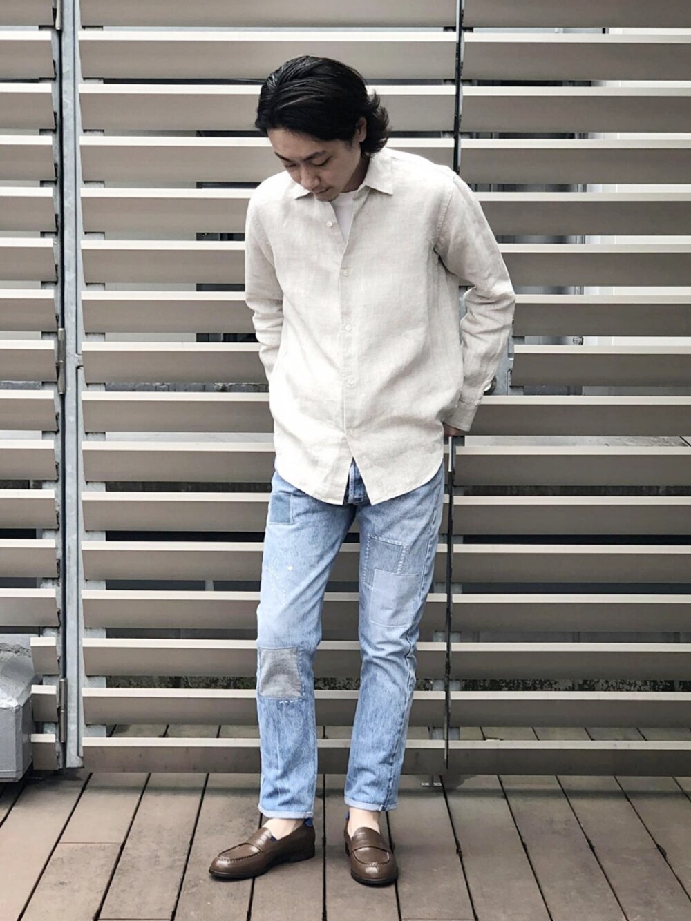 ロングスリーブのシャツでも、素材が麻100%であれば、夏でも快適に着用できるのでおすすめです。 白いシャツには、ライトブルーのデニムをあわせて清涼感のあるカラーでまとめるのがおすすめ◎ STAFF:178cm