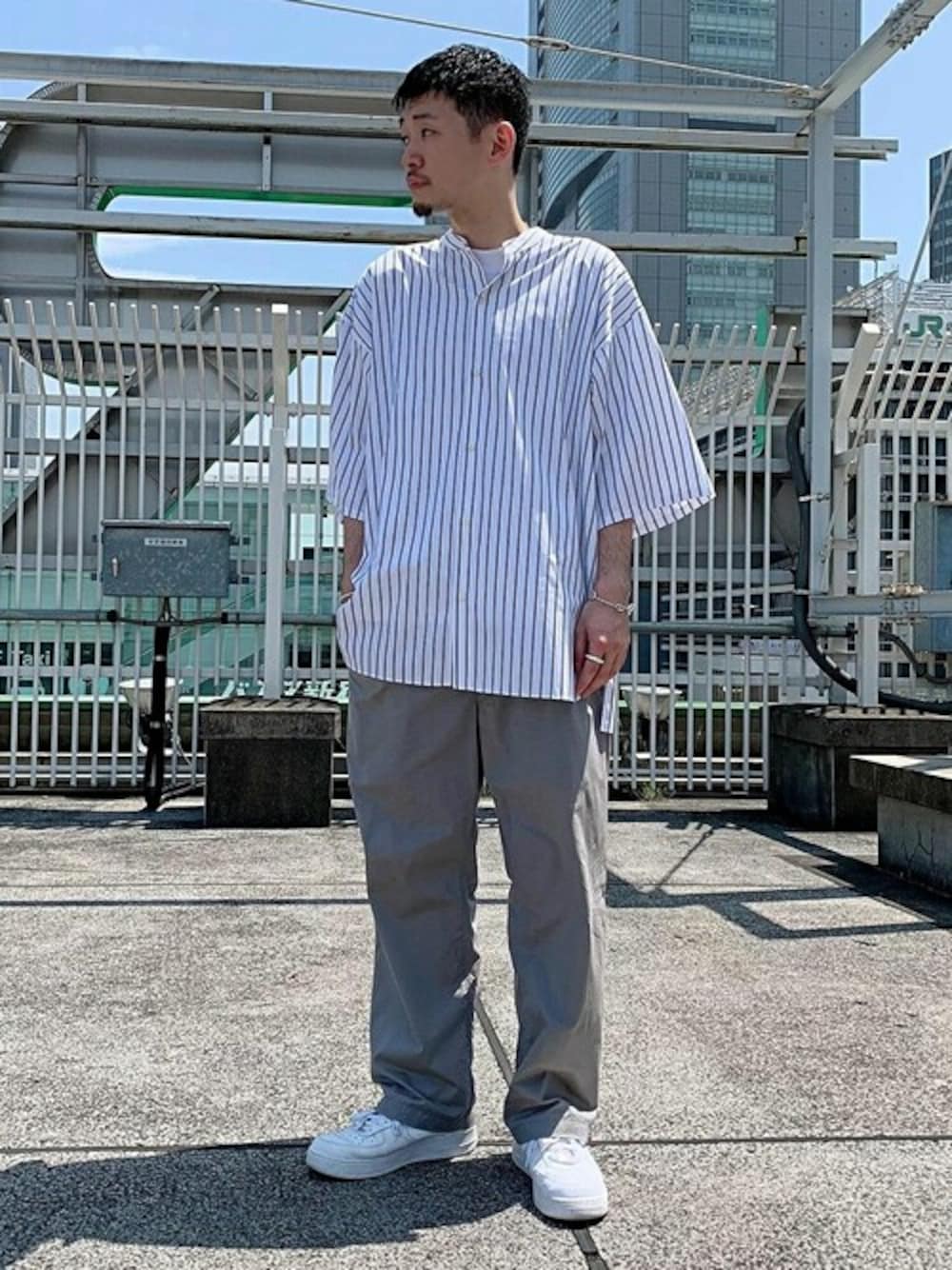 かなりオーバーサイズにデザインされた、シャツのコーディネートです。 夏になるとTシャツスタイルが増えがちですが、少し背筋の伸びるシャツもおすすめです◎ STAFF:174cm