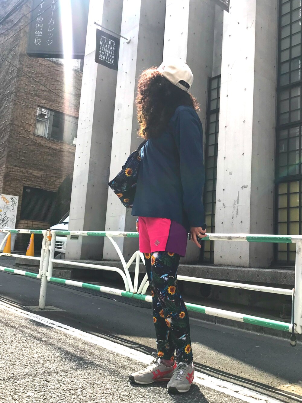 母校前でパチリ✨ シャツのランスタイル🌈 花柄のレギンスとサコッシュを合わせてみました️🌼 ピンクのショートをアクセントに🍭