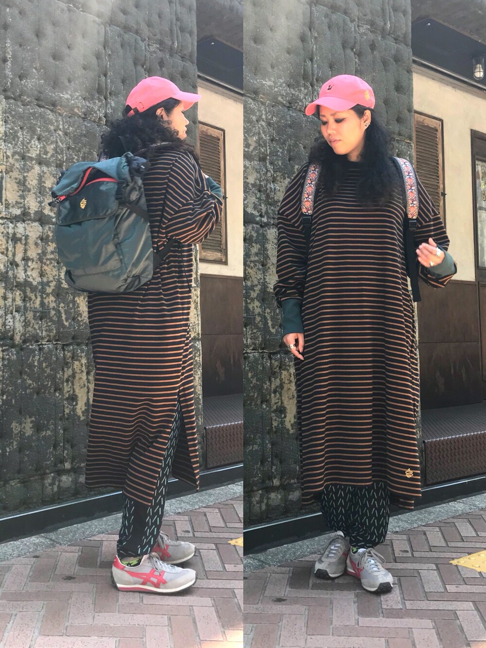 ボーダーのロングワンピに明るめのピンクなCapで外してみましたー❤️ リュックでよりボーイッシュに✨ 梅雨になったらまた冷え込むからまだまだマストなアイテム達ですよー🎶