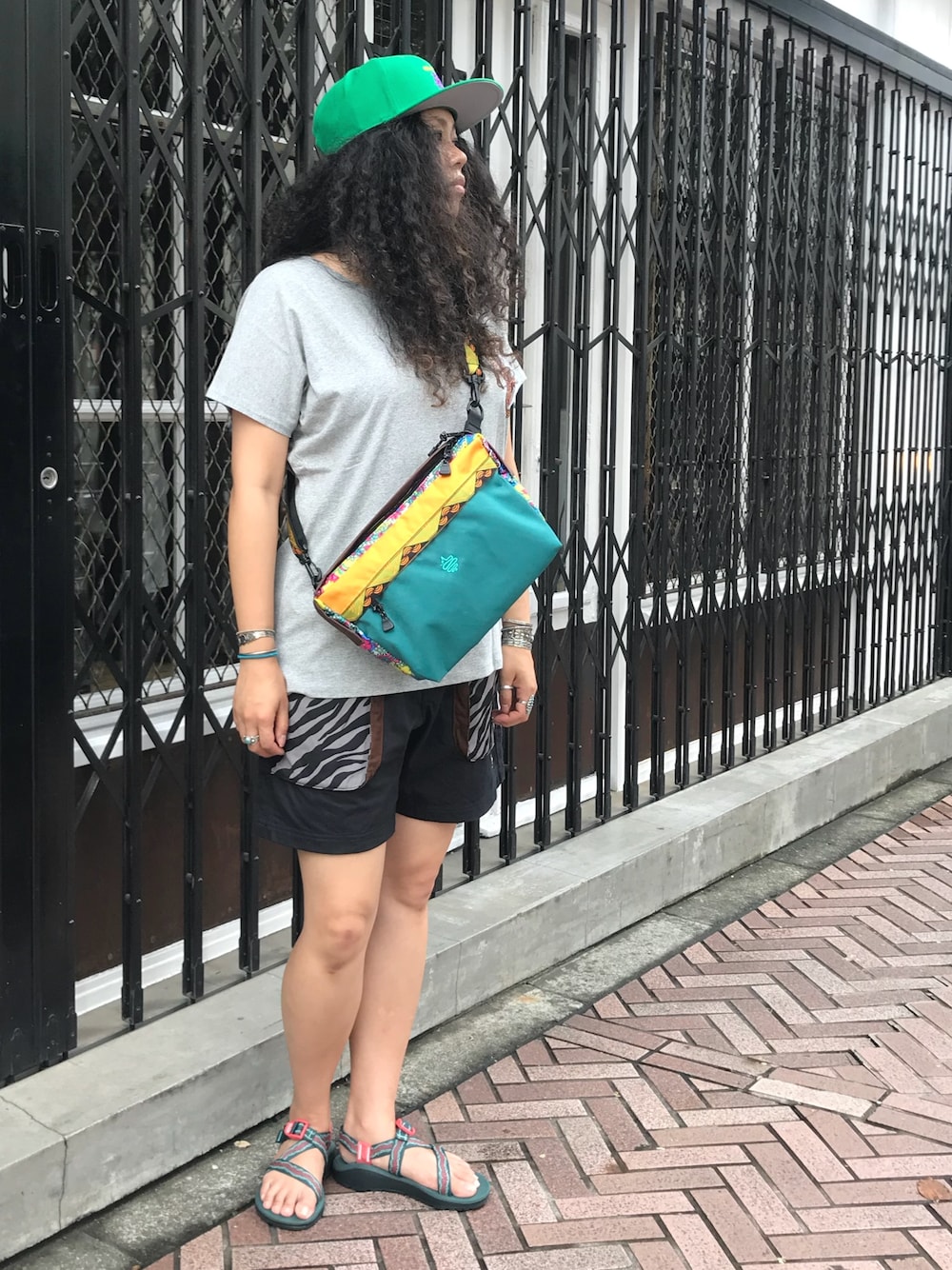 こんにちはー✨ ショルダーバッグとキャップをグリーンで合わせたらなんとも夏らしいスタイルに🐸❤️ グレーやブラックのスタイルでも小物で夏らしくなるのはいいっすよねー🎈✨