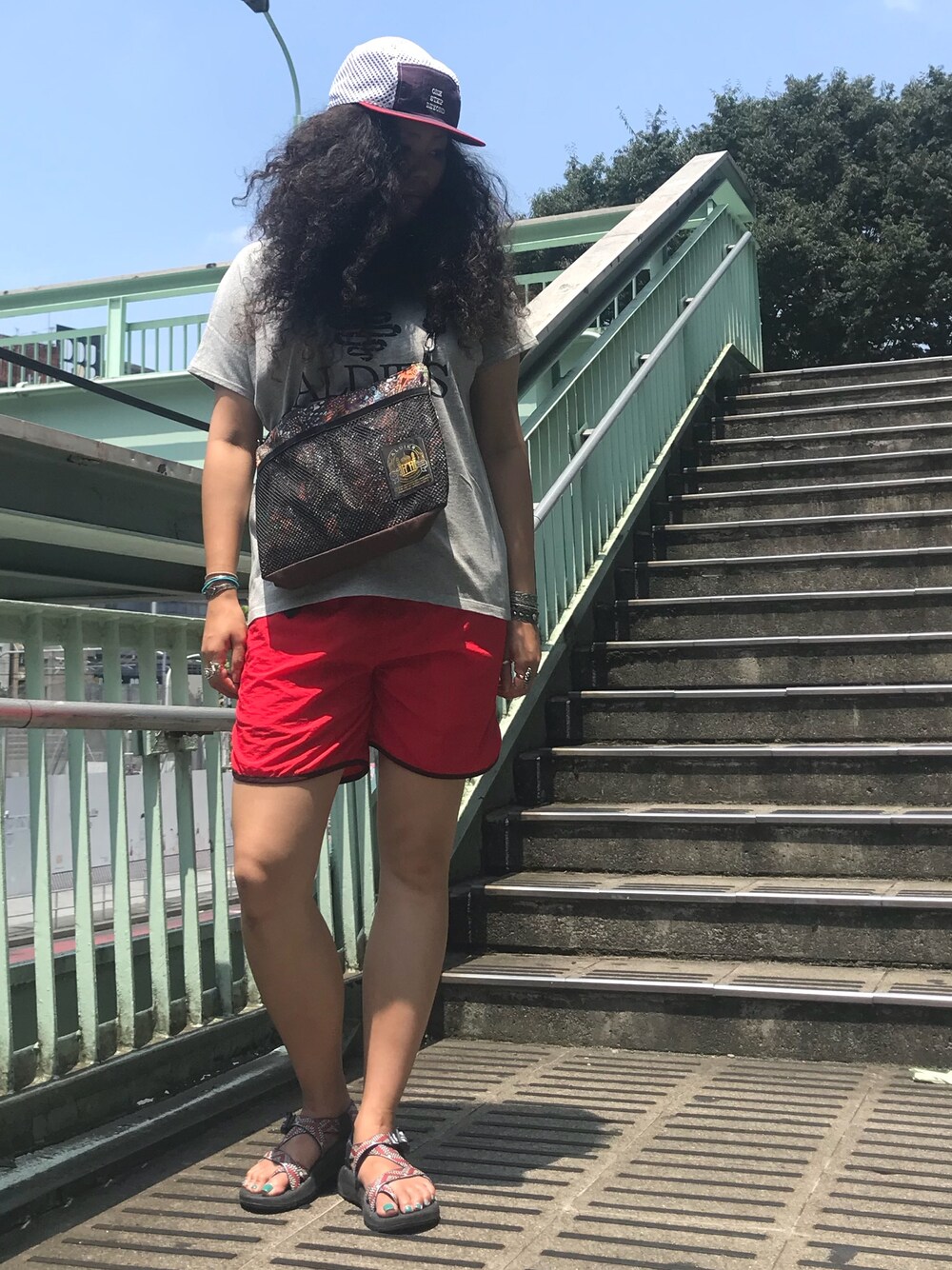 どもどもーー🙌❤️ Tシャツと短パンで楽ちんスタイルーー❤️ スポーティなランパンとメッシュCapがポイント😆❤️