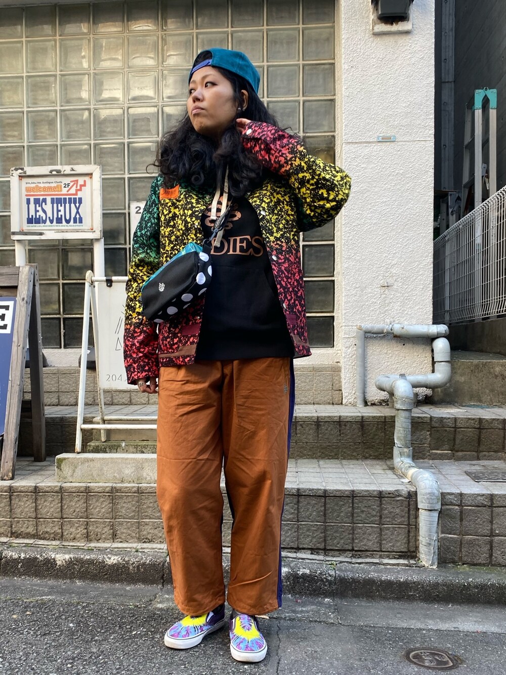 こんにちはー🎶 カラフルなスタイルで冬も楽しめるコーデを🎶 ラスタカラーのジャケットが、目を惹きますよー🎶