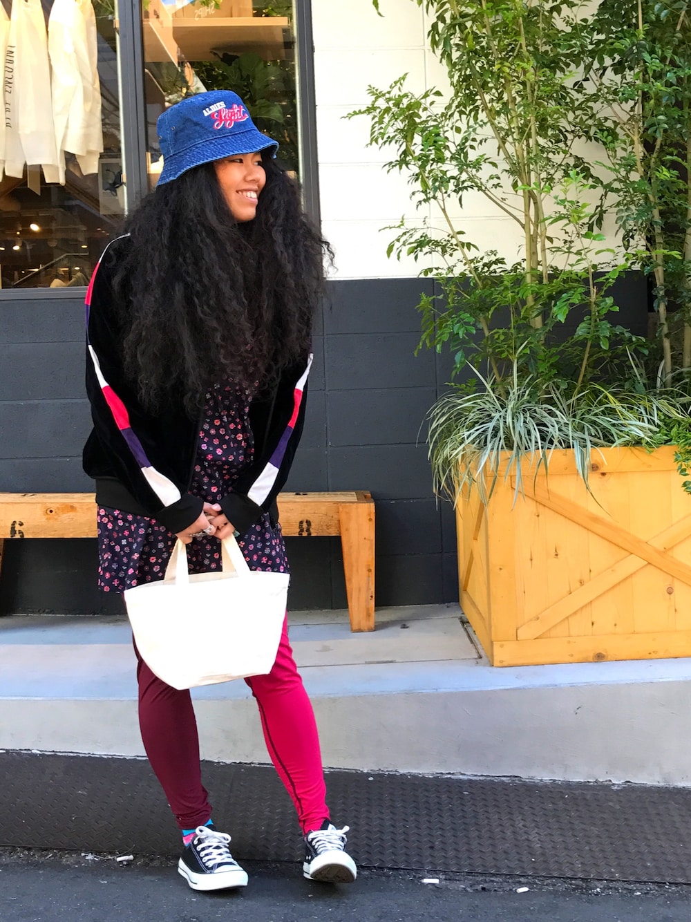 フワっと総柄ワンピにスポーティなジャケットをON🎶 カラーポイントはやっぱりレギンス❤