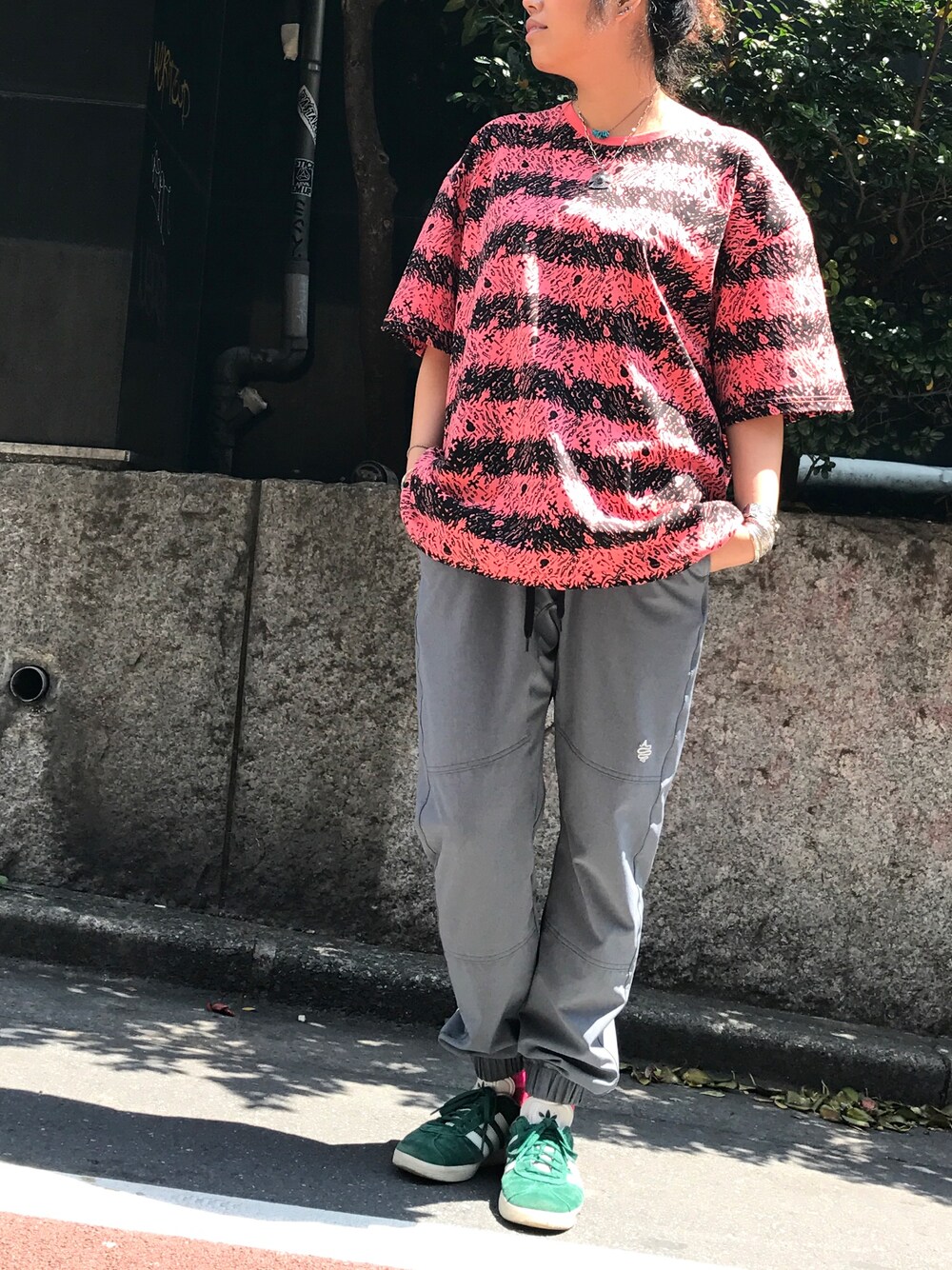 こんにちはー😃👍 ワチャワチャっとした柄ボーダーとスポーティなストレッチパンツ🌵🎶 いやー、、、、楽チンっすわー❤❤❤❤❤