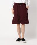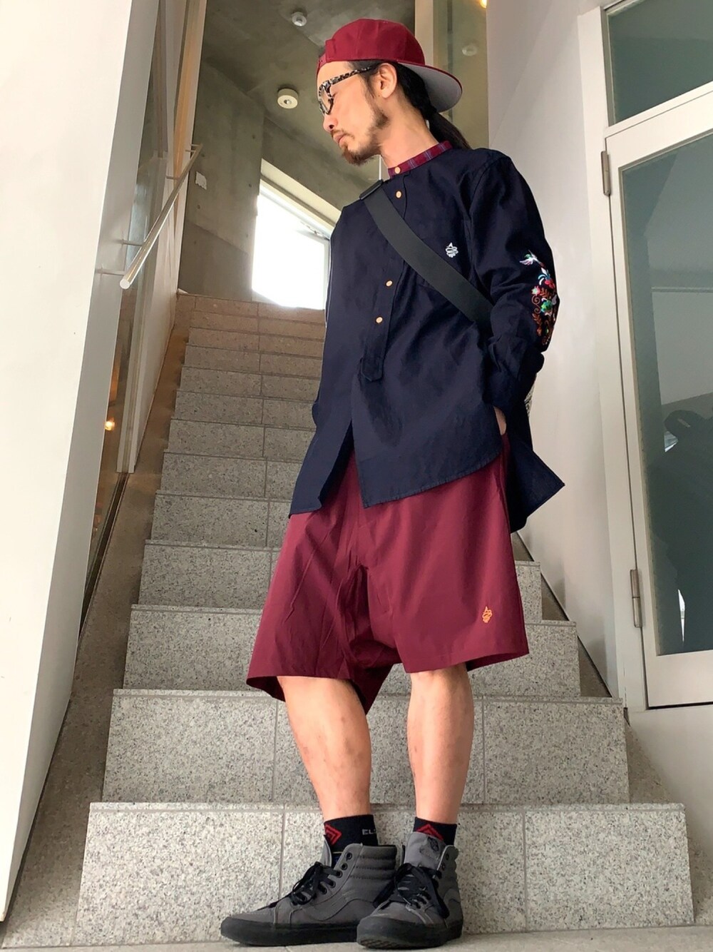 ネイビーとバーガンディしか使っていないシンプルなスタイル。 ミドル丈のシャンブレーシャツに合わせたのは、ストレッチ素材のサルエルショートパンツ。