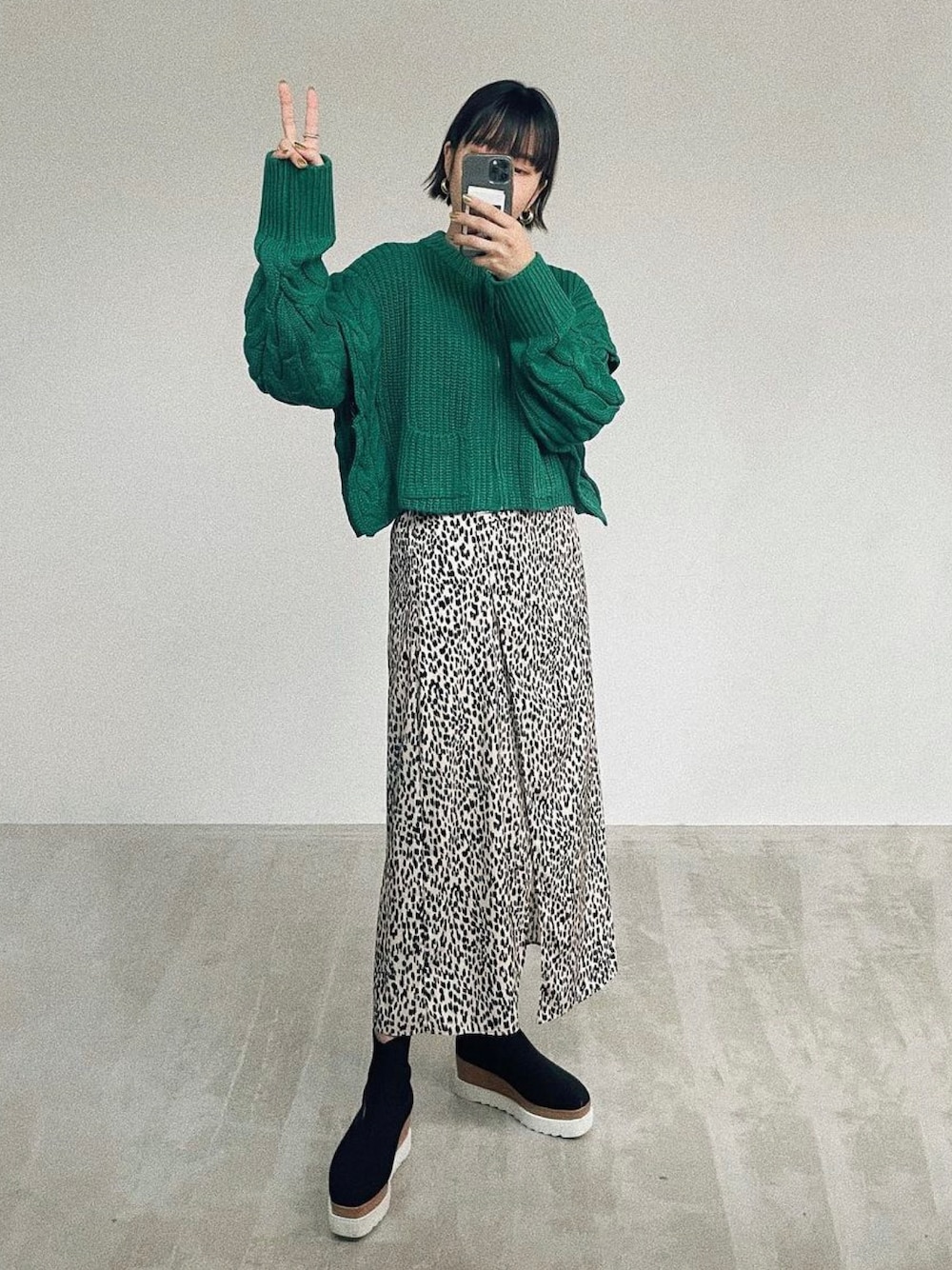 @__araiyuki モデル身長159cm 色んなシーズンに大活躍しちゃう レオパード柄スカート♡ 涼しい春にはシャツ、夏にはTシャツ、秋にはニットと色んなシーズンで楽しめるからこそ定番スカートの仲間入り◎
