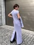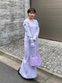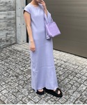 パープル系のワンピースを着用したレディースの春コーディネートの2枚目の写真