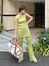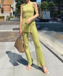 @kaede_fd3 身長:153cm リブ素材の大人のセットアップ♡ 左部分に大きなスリットが入っていて、 お尻まですっぽり隠れる長さはお腹周りをカバーしてくれるよ〜 パンツはハイウエストなので足長効果も◎ 低身長の方はヒールのあるサンダルも合わせるのがおすすめ!