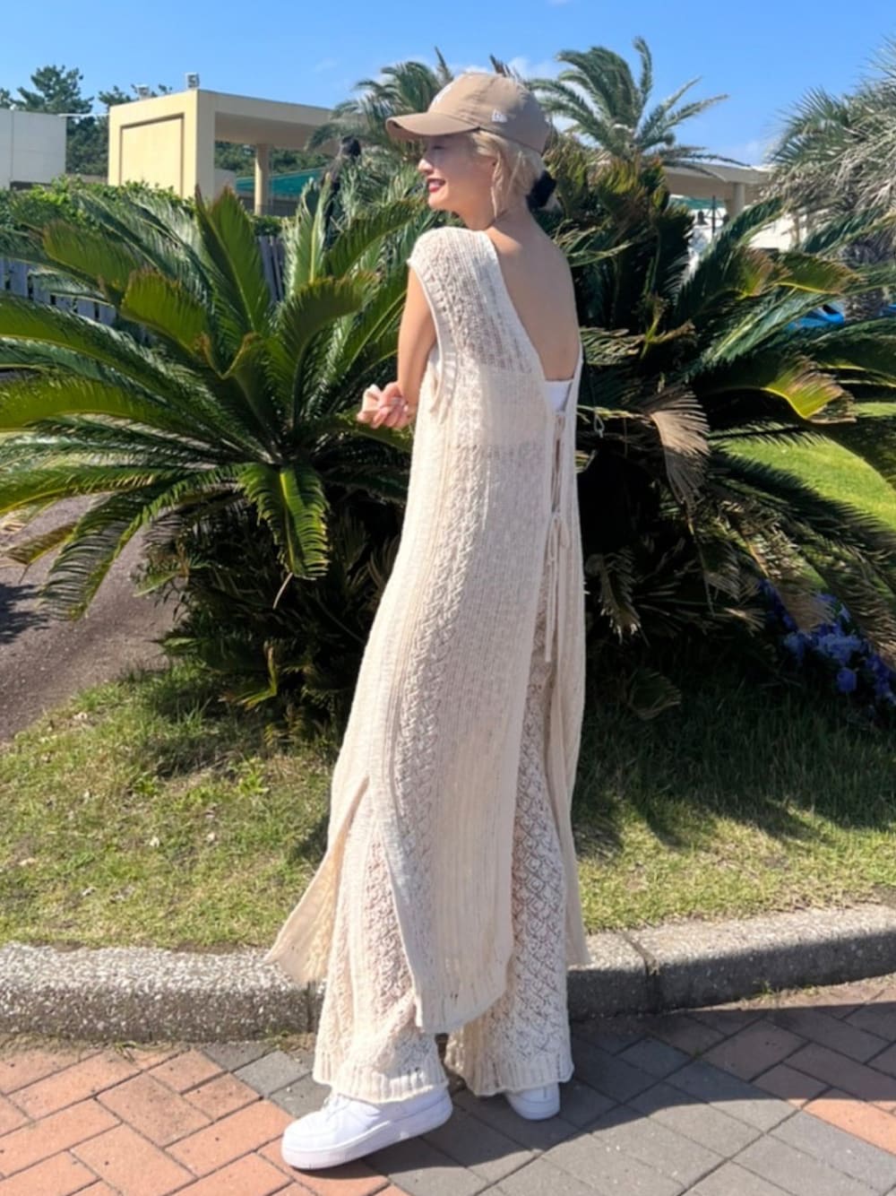 @aiinoshima 身長:167cm ワンピースとしてもジレとしても大活躍なアイテム♡ 同素材のパンツとセットアップでオシャレさup!! お出かけコーデにはキャップとスニーカーがマスト◎