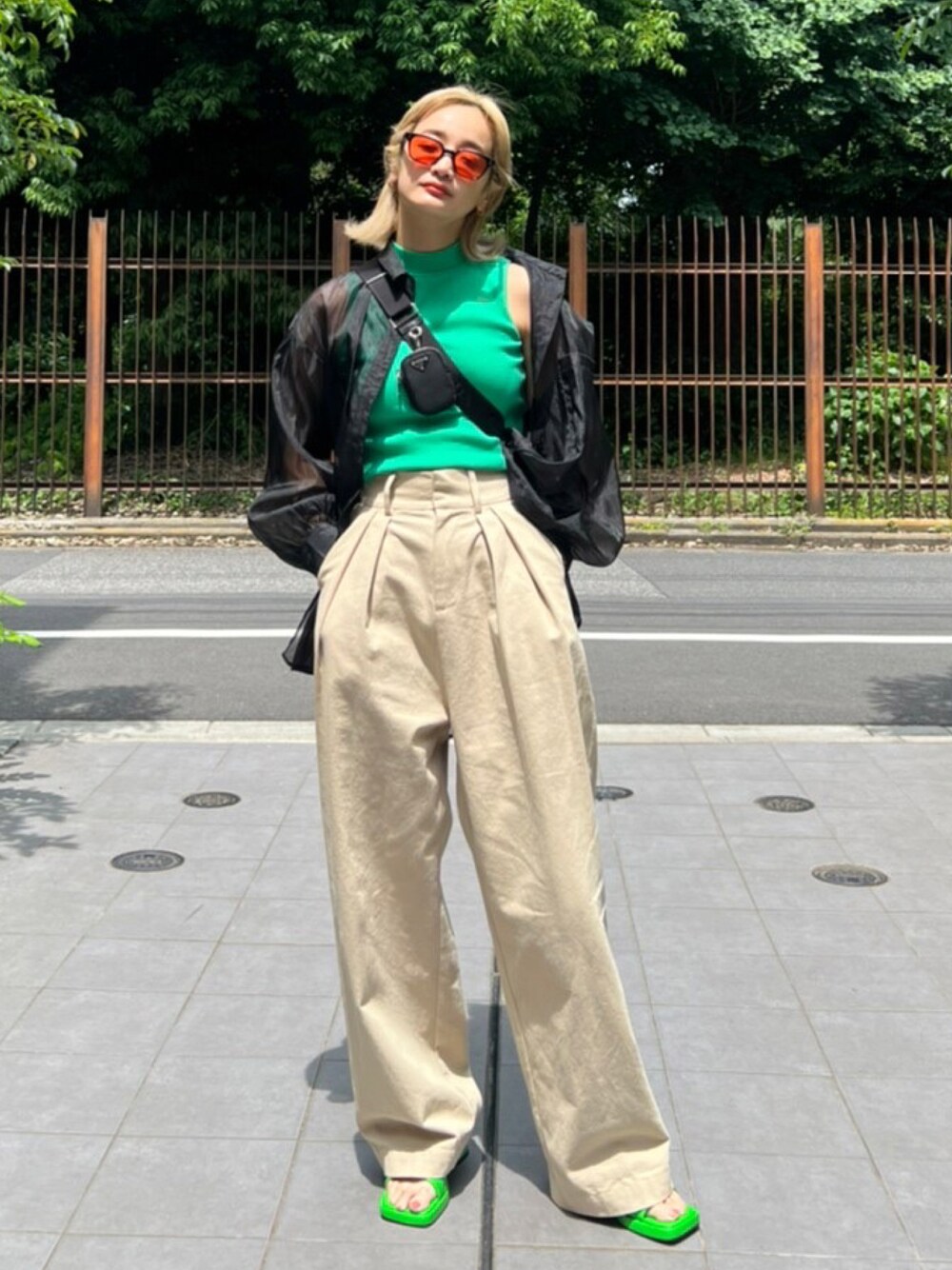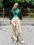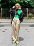 @aiinoshima 身長:167cm ベージュパンツを主役にした人気コーデ♡ インナーとサンダルはグリーンでポイントカラーに、羽織りと鞄は黒で落ち着いた印象に◎