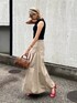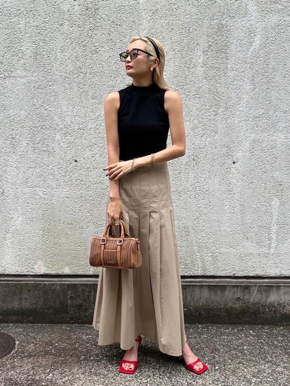 ブラック×ベージュで大人コーデに♡ タックデザインのロングスカートに赤ヒールが女性らしさをぐんとupしてくれます◎ @amail_official ✔︎Fashionable putting bra TT ¥4,950- ✔︎ Casual almond skirt ¥14,300- ✔︎ Amini bostonbag ¥9,900- ✔︎ Mature cawa sandal ¥13,200- @aiinoshima 身長:167cm