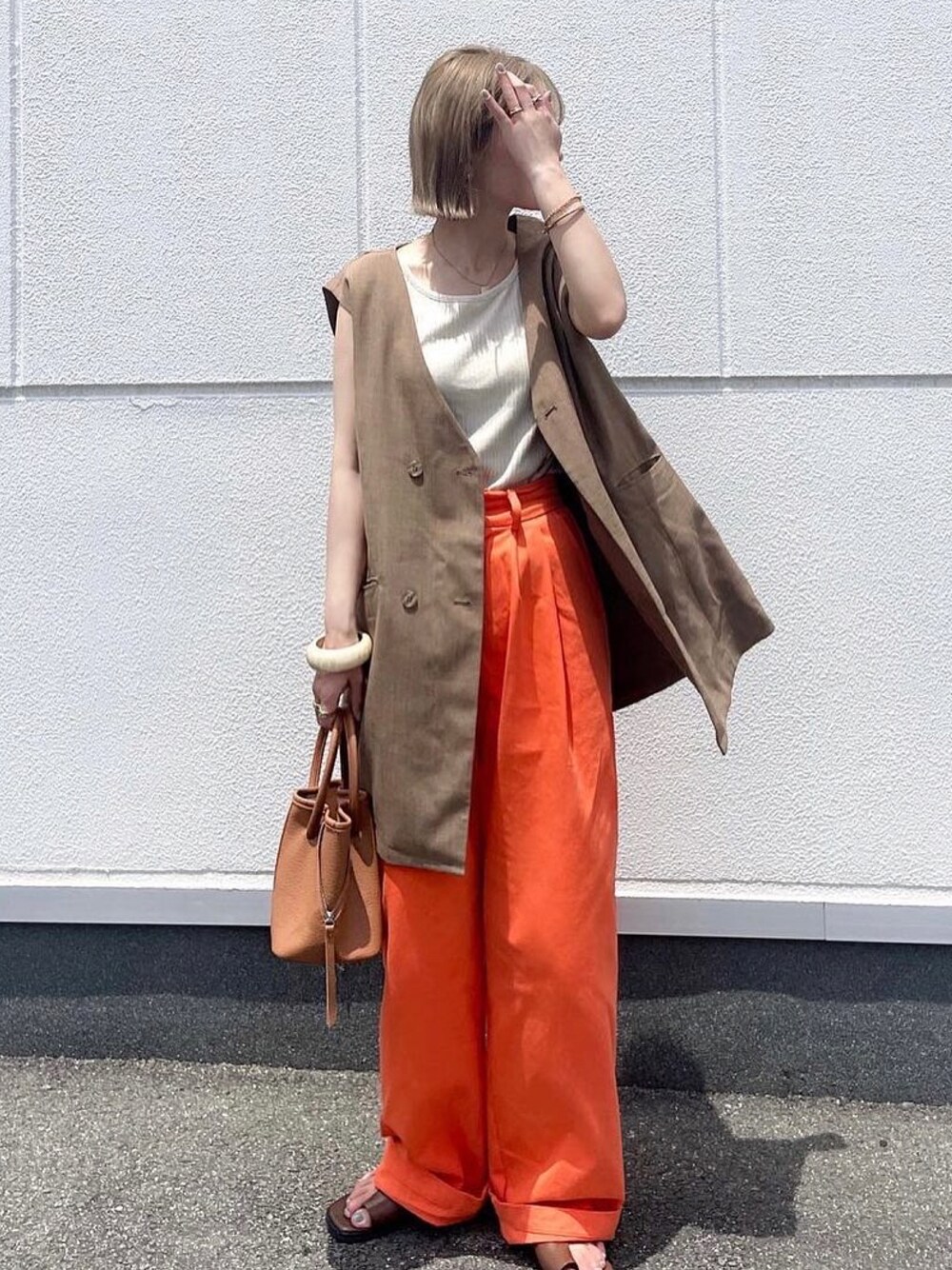 オレンジ系のその他パンツを着用したレディースの夏コーディネートの1枚目の写真