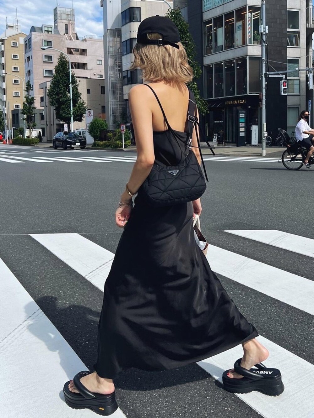 ブラック系のワンピースを着用したレディースの夏コーディネートの2枚目の写真