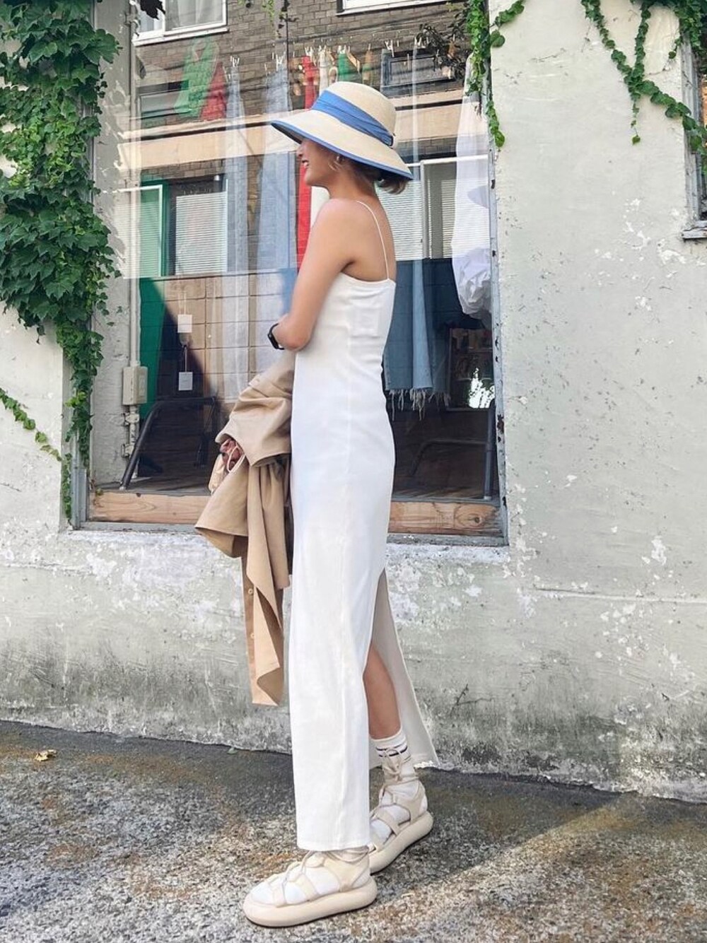 アイボリーコーデ♡ 夏らしい雑材のハットに白ワンピが今の季節にぴったり◎ このワンピースはパット付きだから本当に楽! @aiinoshima 身長:167cm