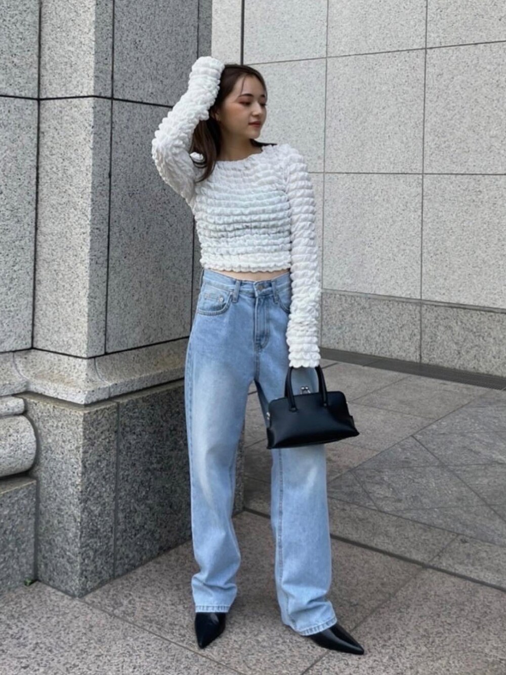 低身長さんにおすすめしたいデニムコーデ♡ テーパードシルエットのデニムとタイトなトップスでスッキリ着こなせます◎ @amail_official ✔︎ Popcorn cloth ¥9,350- ✔︎ Point pocket denim ¥13,200- ✔︎ Gamaguchi bag ¥11,550- @i_am_fukabevi 身長:148cm