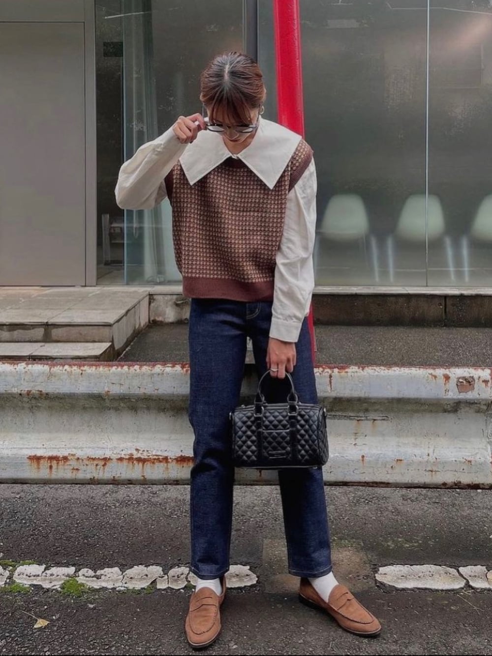 大ぶりな襟がかわいいシャツ♡ 一枚でもレイヤードにもおすすめアイテムです◎ @amail_official Big collar nume shirt ¥14,300- Uso vest ¥8,800- Quilting bossbag ¥9,900- @__araiyuki 身長:159cm