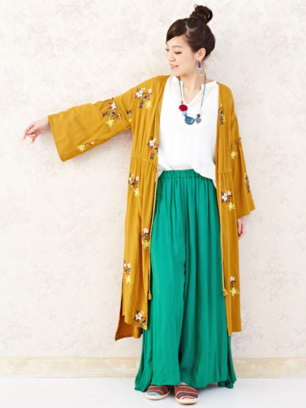 チャイハネSTAFF amiのカーディガン/ボレロ「【チャイハネ】yul 花刺繍ロングカーディガン ガウン」を使ったコーディネート