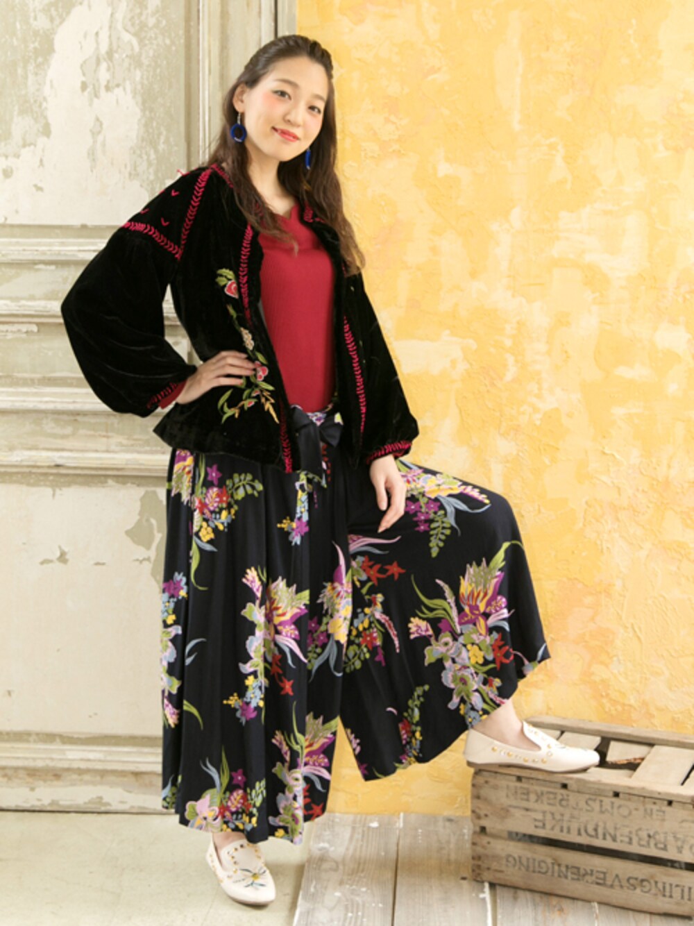 花刺繍やステッチがたっぷりあしらわれたベロアのブルゾンに、 ワイドシルエットのボタニカル柄パンツを合わせたコーディネート。 とっても華やかなフォークロアスタイルに★*
