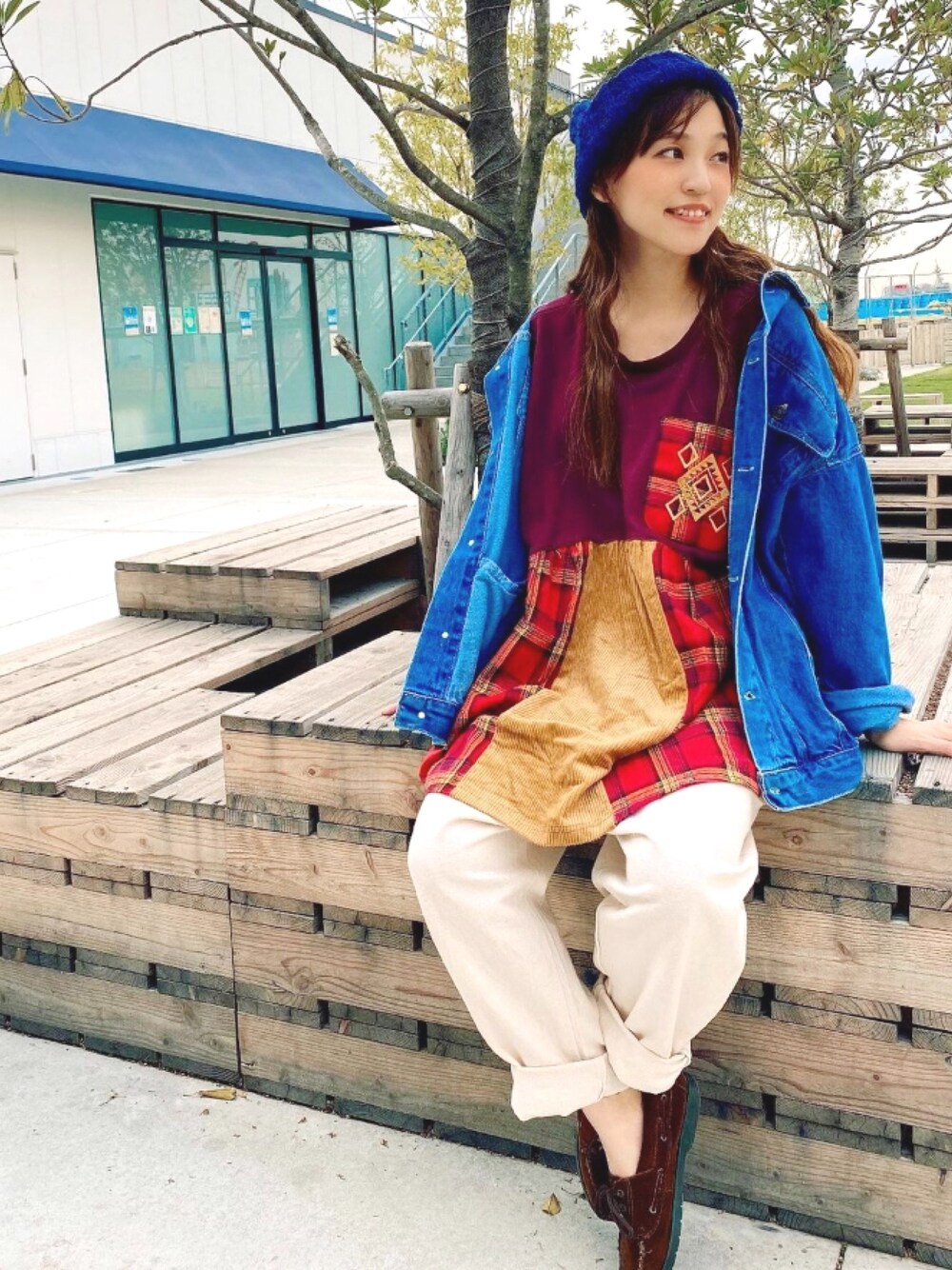 チャイハネSTAFF amiのスウェット「【チャイハネ】チェック&コーデュロイ パッチワークチュニック」を使ったコーディネート