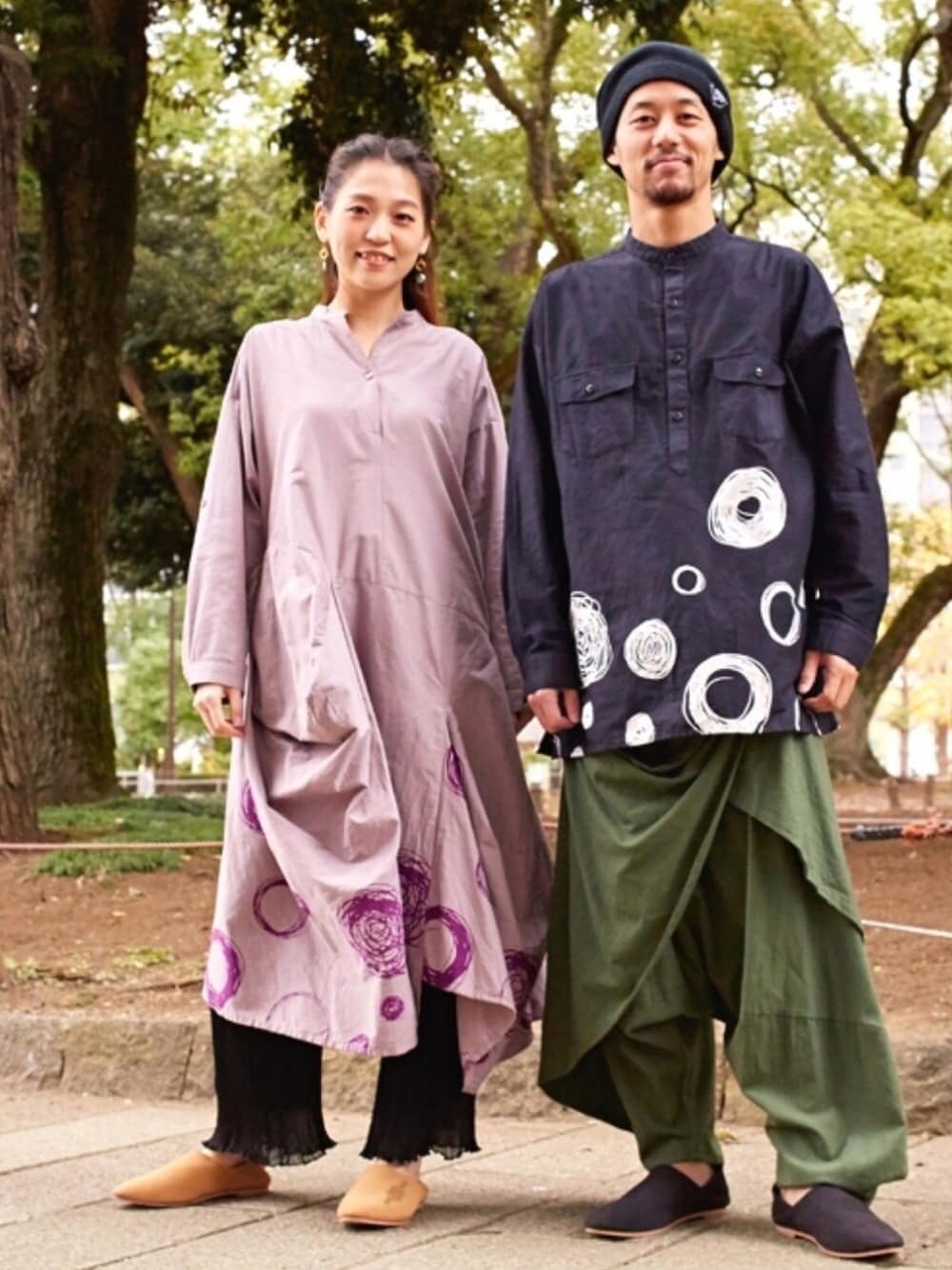 - Traveler Mode Style - 手描き風のドット柄がモードな印象を与える変形ワンピースとメンズバンドカラーシャツ。 心地良いインド綿を使用しています。 カップルやご夫婦で同じテイストで合わせるのも◎ いつもの街角も、自分らしさを際立たせた非日常に。