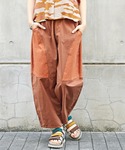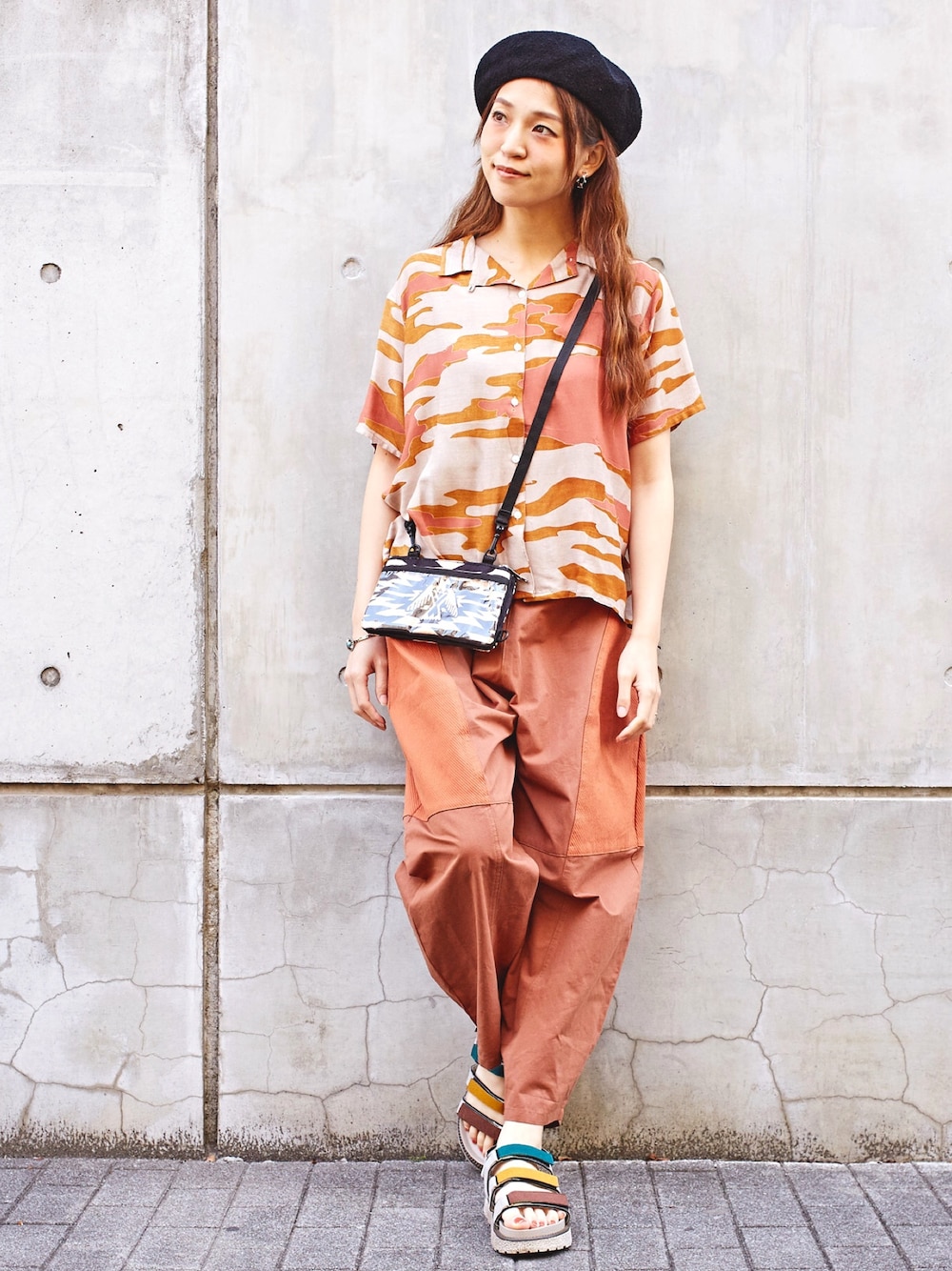 自然の恵み、雄大な大地をイメージしたブラウンカラーのシャツ。 ボトムには3種の異素材をパッチワークしたコクーンパンツとカラフルなサンダルで遊び心をプラス✴︎