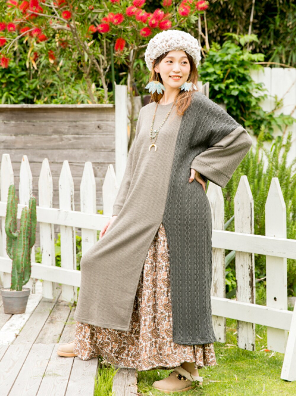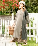 ナチュラルなカラーのロングスリットワンピースに、ボリュームたっぷりなワイドパンツを合わせて。 秋のフォークロアスタイル◇◆