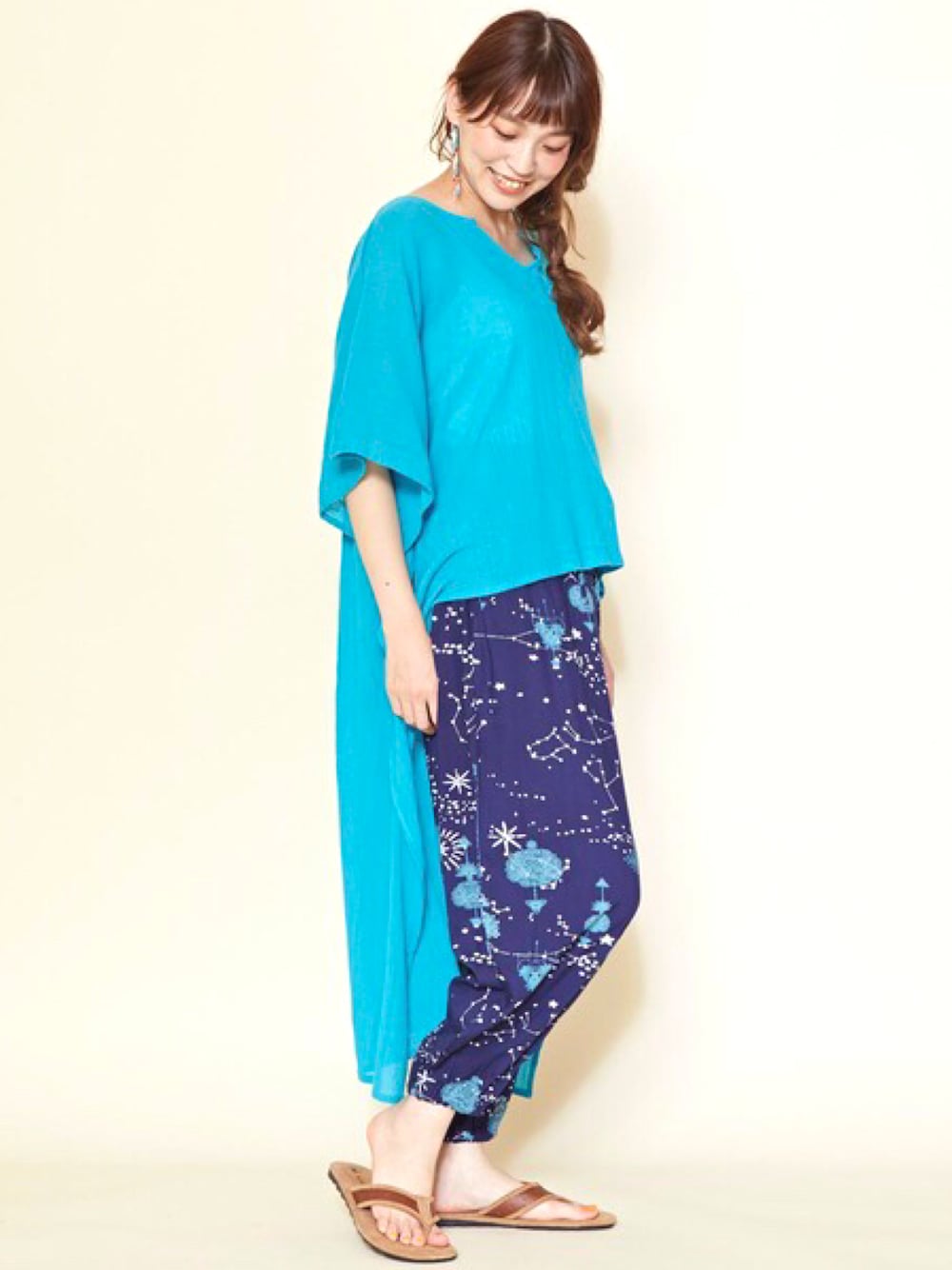 先日ご紹介したハイローヘムワンピの色違い♪ とっても着やすいので、色違いホントおすすめです◎ パンツは、夏の夜空をイメージした星座柄…★ 涼しく穿けるので夏コーデにぴったり。 夏が待ち遠しいです♪*