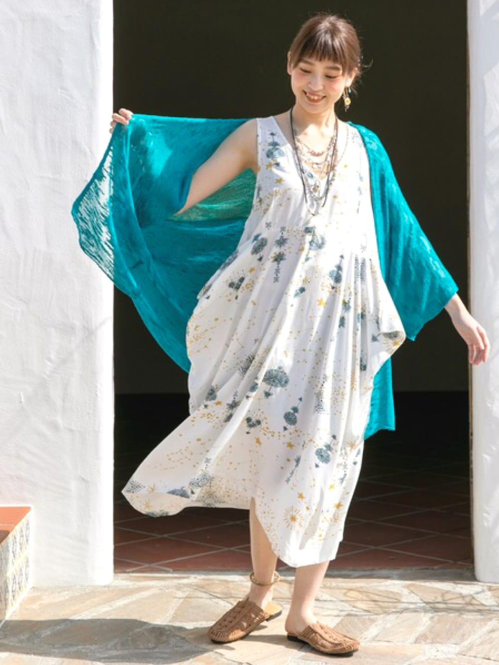 まだ梅雨なのに今日は真夏のような暑さですね。 そんな季節にぴったりなノースリーブワンピース♪ 夏の夜空をイメージした星座柄…★* 両サイドの変形ドレープが効いた遊び心のあるデザイン。 個性的で爽やかなエスニックスタイル✴︎