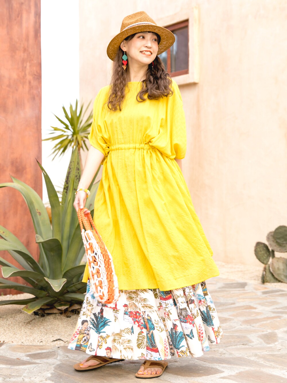気分が上がる!夏コーデにぴったりなワンピース♪ 大胆なサイドスリット入りで、 ロングスカートやワイドパンツなど、 様々なボトムとのレイヤードスタイルが楽しめます◎