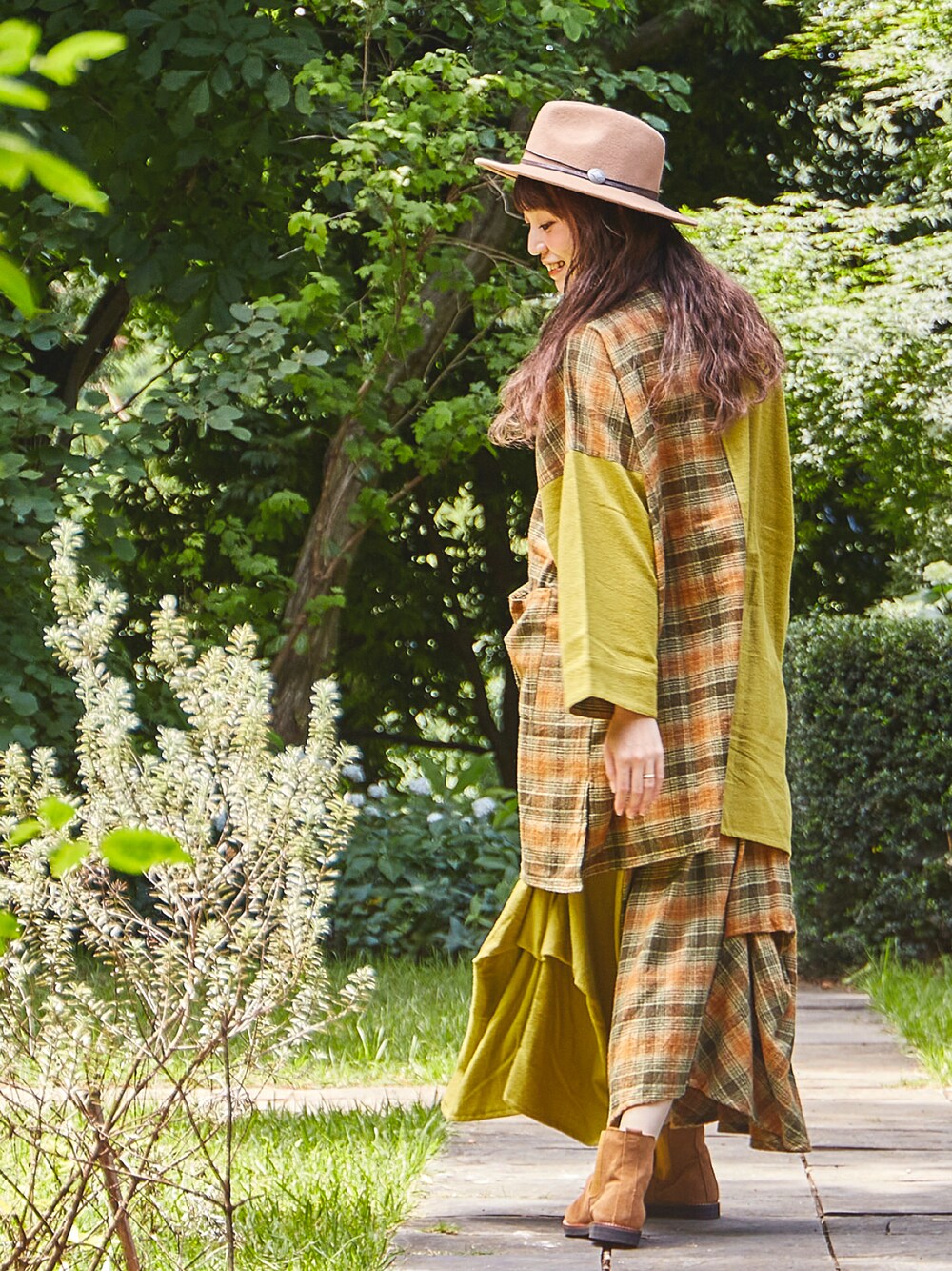 インド綿ならではの心地良い風合い。 秋冬コーデにぴったりなイエロー✴︎ チェックと無地を組み合わせた、 遊び心たっぷりなセットアップ♪