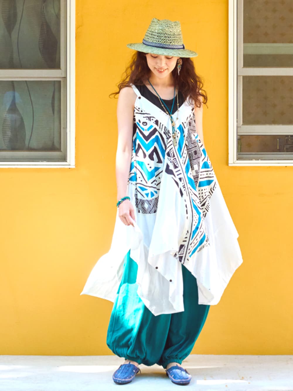 キャミワンピとしても サロペットとしても着られるアイテム! アフリカンなトライバル柄が印象的✴︎ 夏フェスコーデにもおすすめ◎