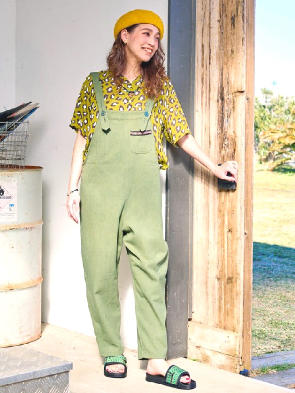 シンプルなカーキ色のインド綿サロペット✴︎ デイリーユースはもちろん、キャンプなどのアウトドアシーンでも大活躍◎