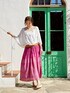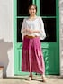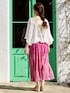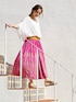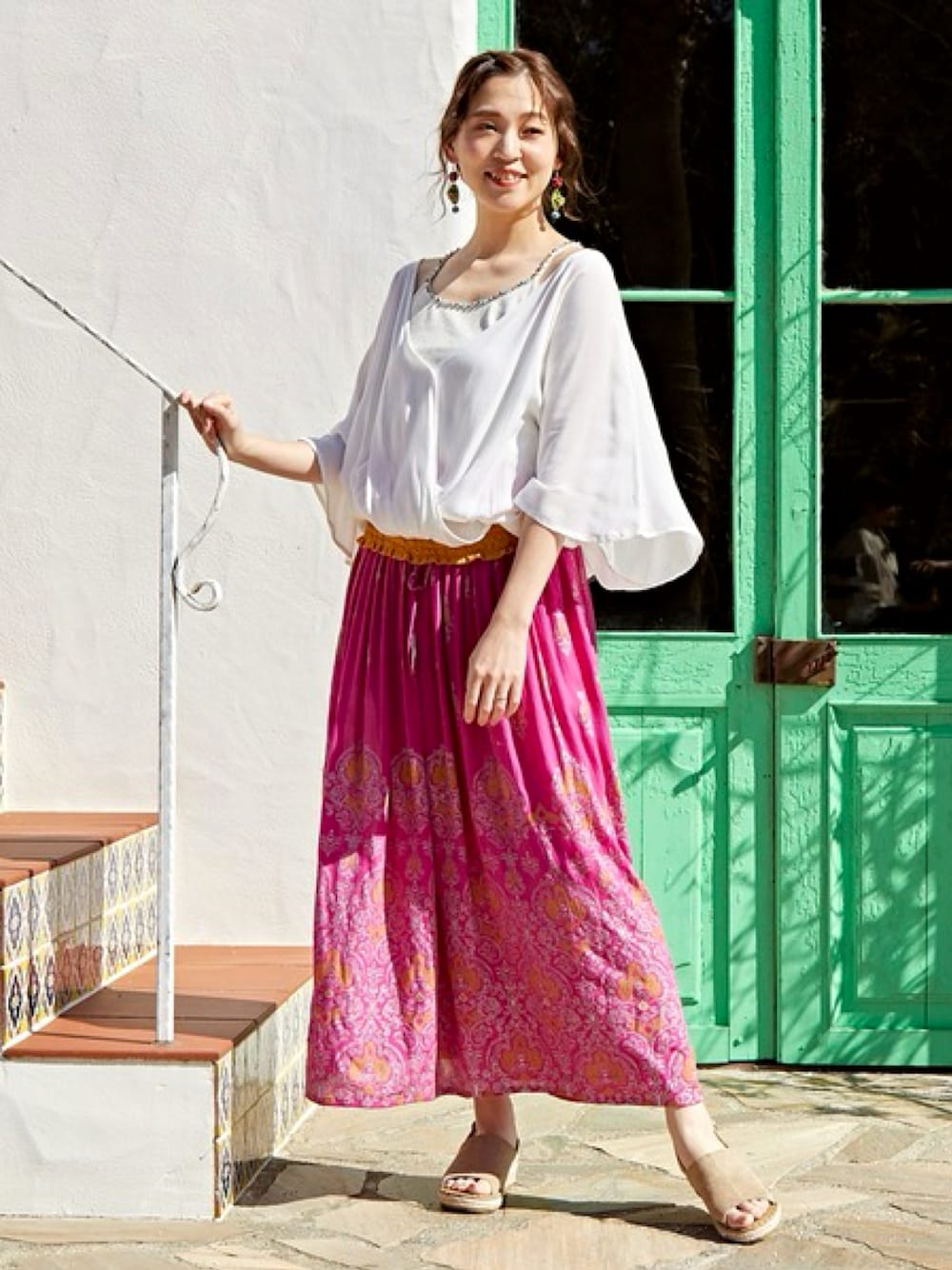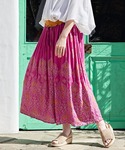 インドならではエキゾチックな柄が目を惹くピンクのスカート🩷 涼やかなレーヨンクレープ生地で、夏におすすめなスタイル♪