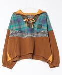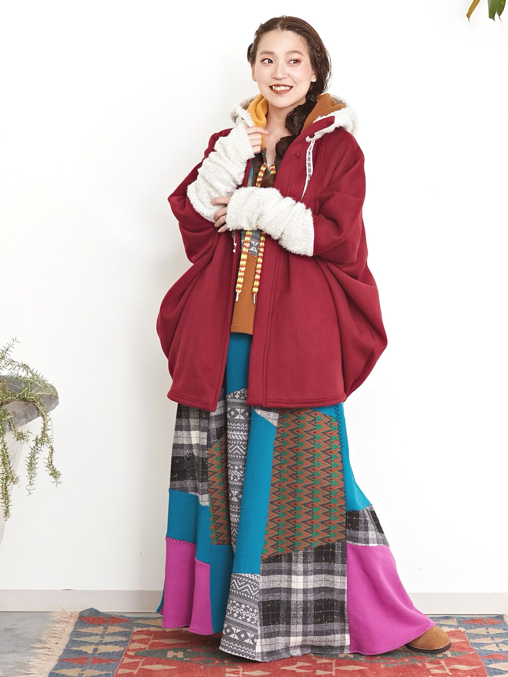 丸みのあるシルエットが可愛いオーバーサイズのポンチョ風フードジャケット。 スウェット裏起毛で暖かさも◎ アームウォーマーのようなくしゅくしゅとした袖やチャイナボタン、チロリアンテープもポイント♪ カラフルなパッチワークスカートと合わせて、他には無いこだわりのスタイルを楽しめます✳︎