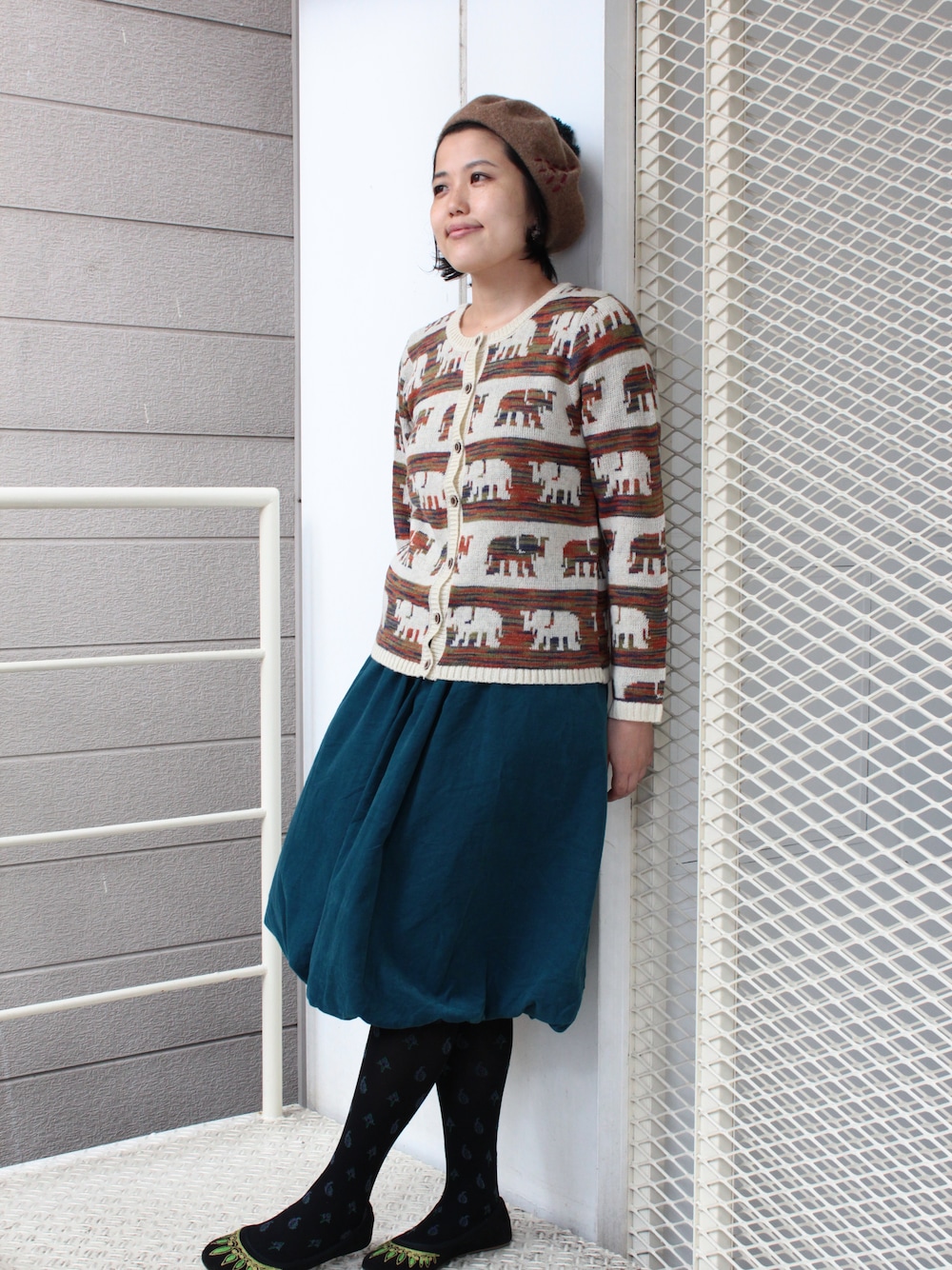 ボーダー状にゾウが見え隠れする、アフリカンテイストなニットカーデが主役のコーデ。 やわらかなモヘア風の糸で編まれています。 流行のミモレ丈スカートとも相性◎です♪