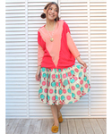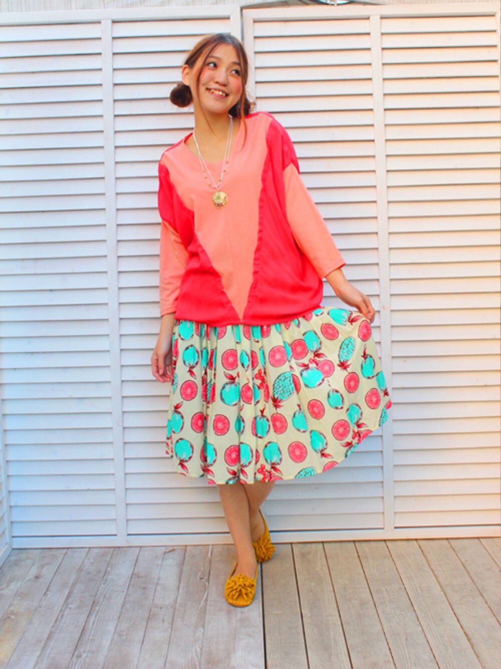 めずらしくスウィートな色合わせなコーデ。 フルーツ柄に万能トップスを合わせました。 フルーツ柄スカートは、靴下+スニーカーで元気に履いても良し◎ですね! 柄違いに動物柄もあって、そちらも元気でかわいいので是非チェックしてください♪