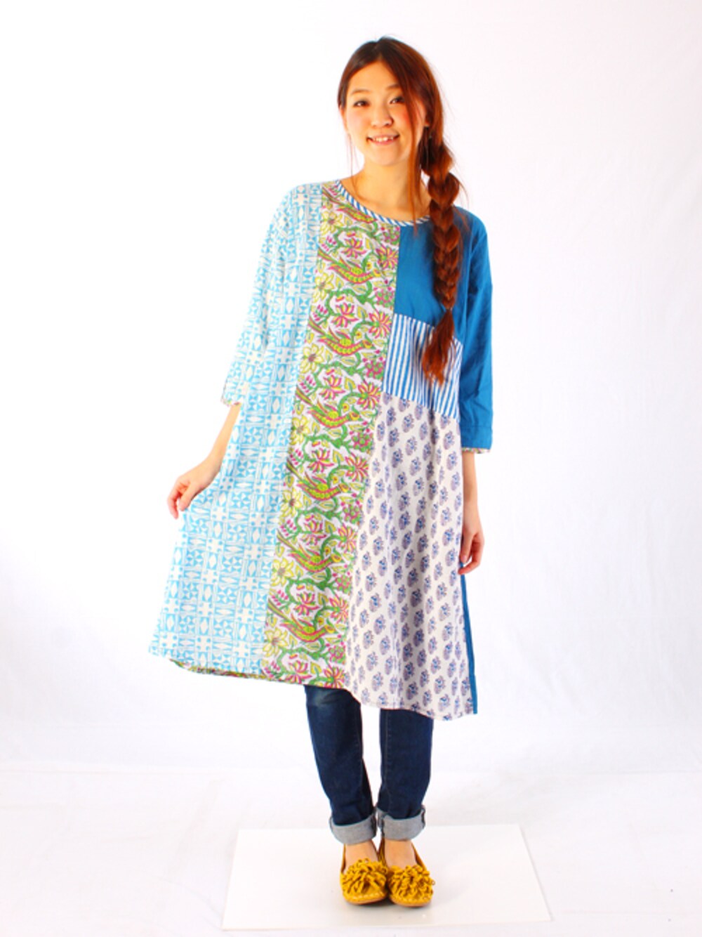 涼しげなインド綿にINDIA伝統技法「ブロックプリント」をあしらった、 ハンドワーク感満載のチャイハネオリジナルワンピース。 縦のラインでパッチワークしていますのでスタイル良く見えます♪ カラフルな色合いでコレ1枚でコーデの主役に☆