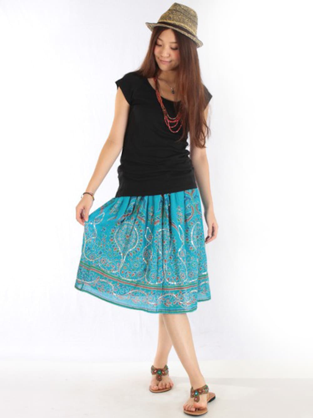 ◆爽やかなターコイズカラーのスカート◆ スパンコールが、眩しい太陽の光にキラキラしてとってもキレイ★ まるでインドの民族衣装「サリー」のような煌びやかさなんです♪ エスニック&ボヘミアンコーデに大活躍の1枚!
