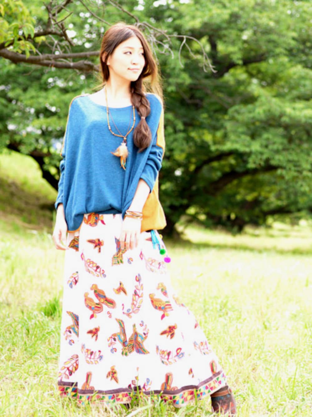 こんな晴れた日は 外でお散歩 南米パナマの民芸「モラ」を イメージしたプリントのロングスカート カラフルな鳥やポンポンが気に入ってます♪ フォークロア感たっぷりのコーデ★