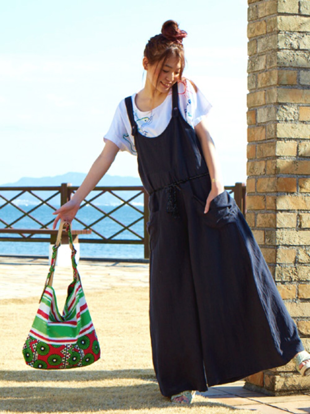 今シーズン注目のワイドパンツシルエットのサロペット♪ シンプルなデザインなので、アフリカ柄のバッグをアクセントにしてみました★ 涼しげなインド綿で、夏コーデに大活躍の1枚です◎