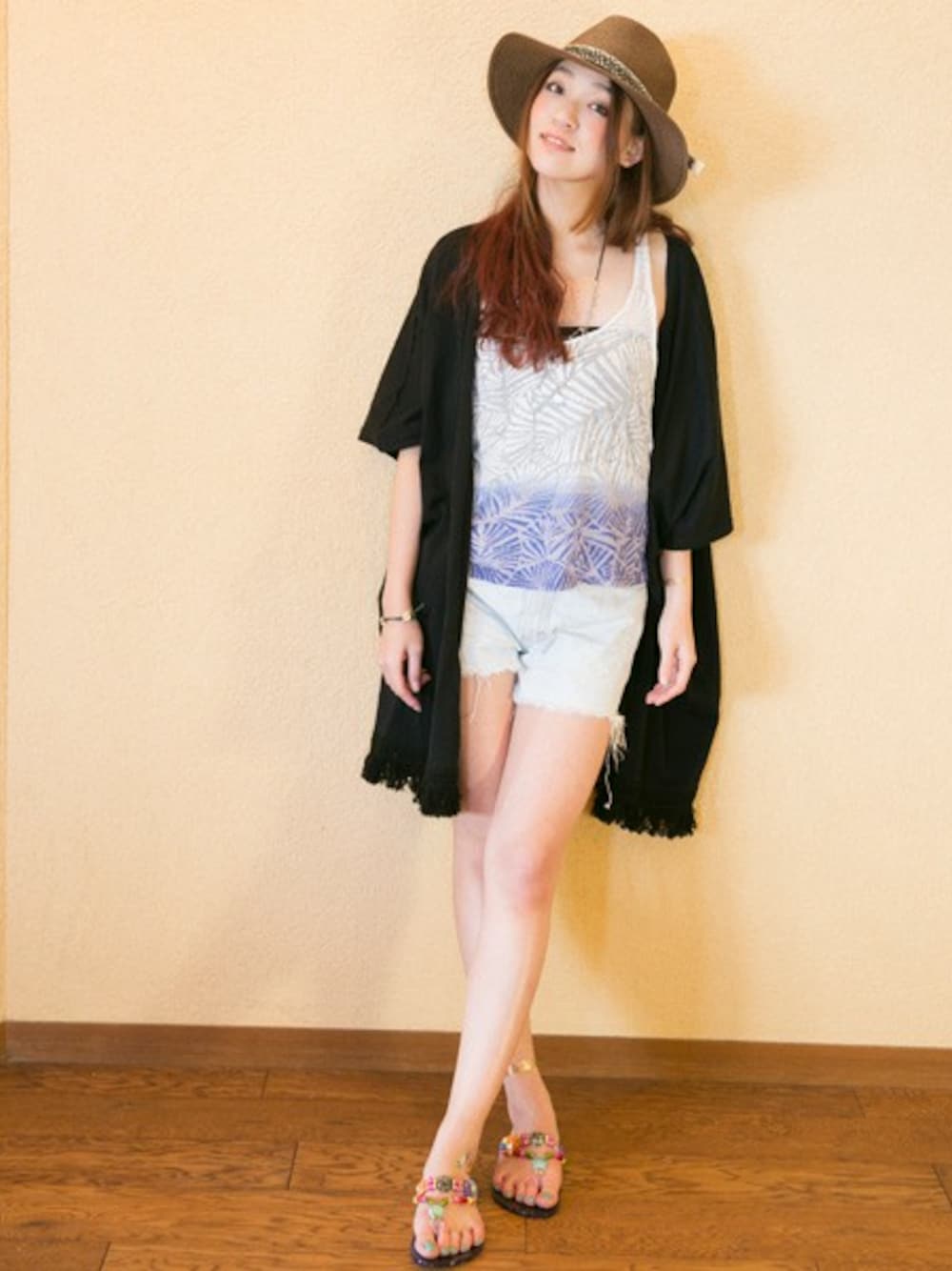 黒のフリンジカーディガンに ショートパンツをコーディネート★ 夏を楽しむボヘミアンスタイルに♪♪