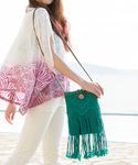 透け感のある爽やかなグラデーショントップスに ロングフリンジのポシェットをコーディネート♪ ちょっぴりボヘミアンな夏スタイル☆