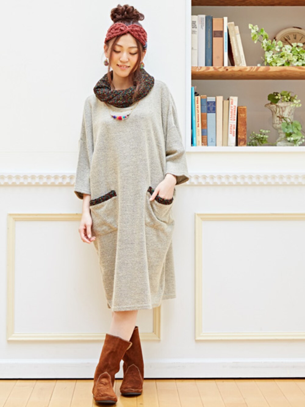 スヌードをしているような たっぷりしたえりが可愛らしいビッグシルエットのワンピース* ウールやフェルトのアクセサリーをプラスして ほっこりあたたかみのある感じにしました♪ 秋コーデにおすすめです♪♪