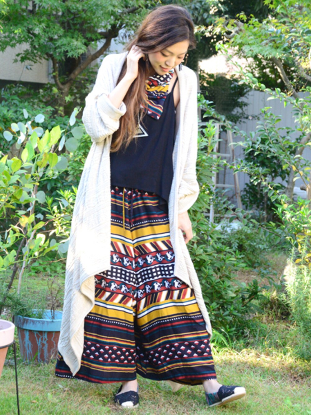 ちょっぴりレトロなヴィンテージカラーのワイドパンツサロペット◇◆ 同じ柄のスカーフ付きなので、 首に巻いたりヘアアクセにしたり、いろいろ楽しめます♪ メンズサイズのカーデをゆったり羽織ってマニッシュな雰囲気に◎