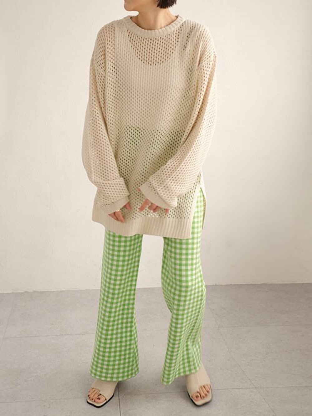 ANDJのニット/セーター「コットンタッチフィッシュネットメッシュ編みニット」を使ったコーディネート