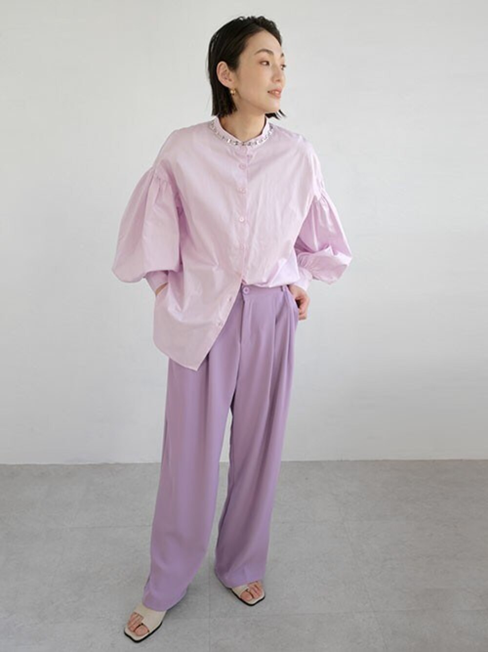 ボリューム袖バンドカラーブラウス(tb77c05047) ダブルタックセミワイドスラックスパンツ(bf09q05012) instagram:andj_jp IGTVにて動画配信中📷