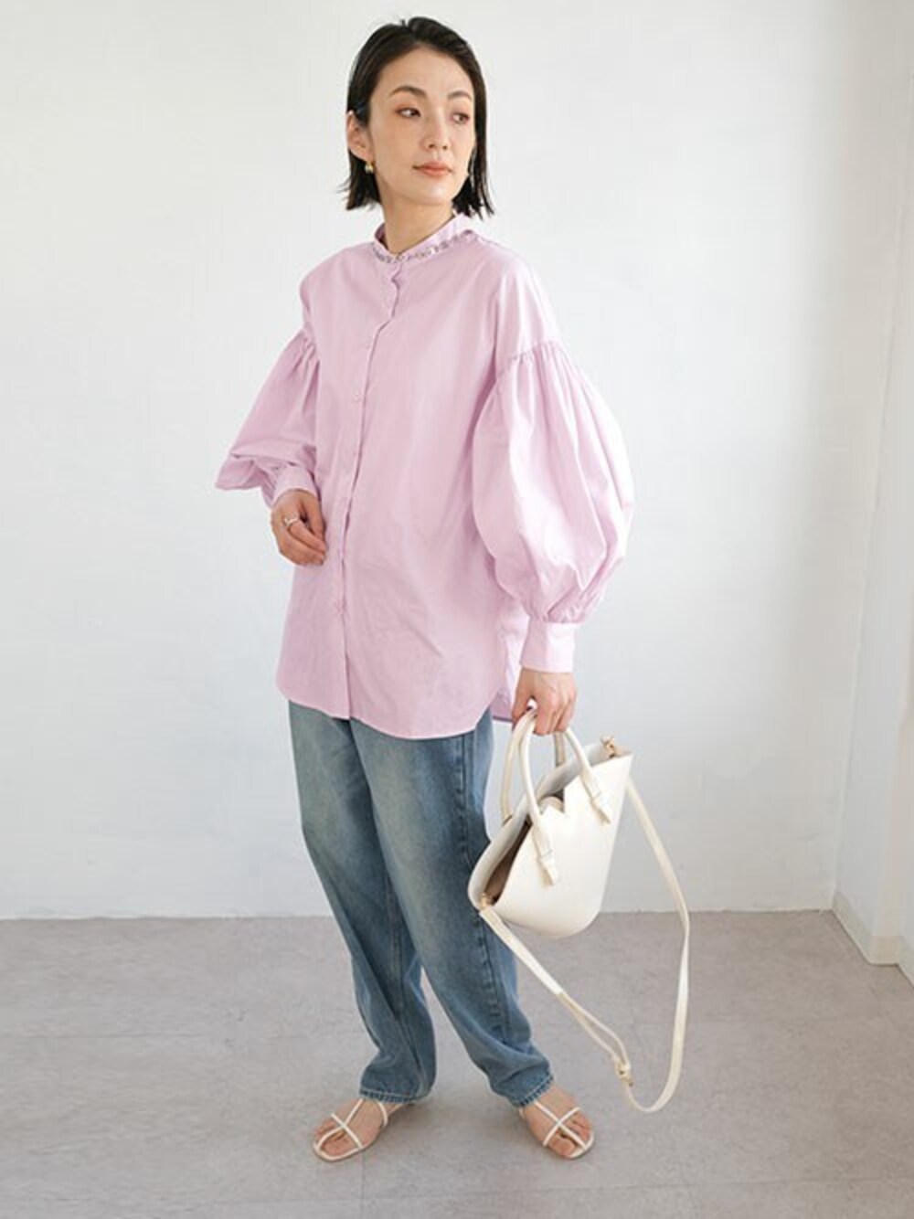 ボリューム袖バンドカラーブラウス(tb77c05047) 13.5ozハイウエストテーパードデニムパンツ(bg77c05046) instagram:andj_jp IGTVにて動画配信中📷