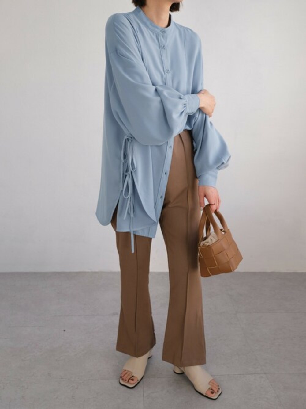 サイドリボンバンドカラーシャツ(tb76q04771) センタープレスジョーゼットセミフレアパンツ(bc80c04515) instagram:andj_jp