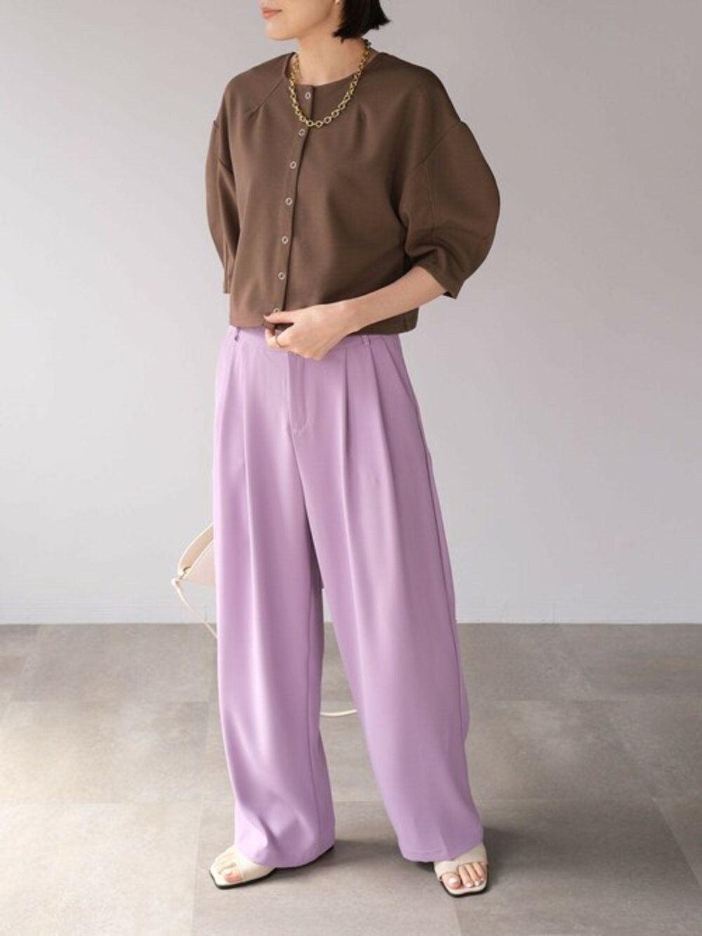 2WAY丸袖ショートカーディガン(td76c05058) ダブルタックセミワイドスラックスパンツ(bf09q05012) instagram: andj_jp